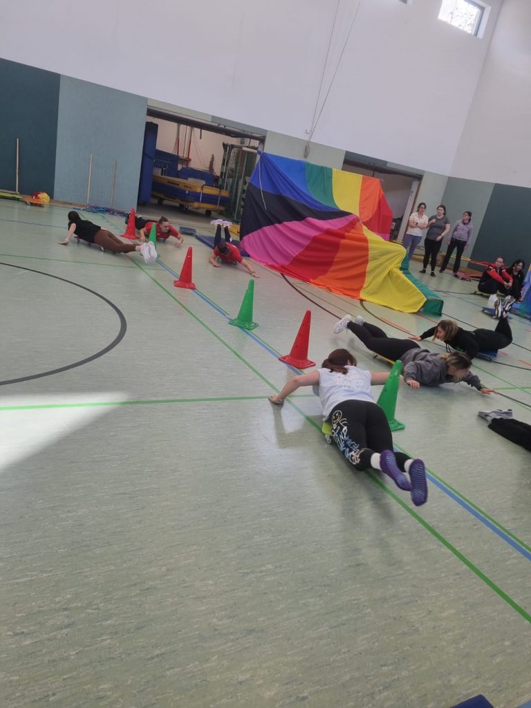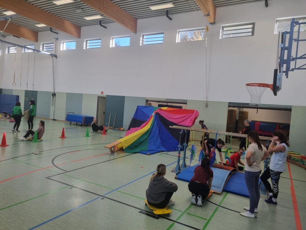 Im Mittelpunkt standen sowohl Ideen für Gerätestationen und den Einsatz von Kleingeräte als auch Sing- und Bewegungsspiele. Die Inhalte zum „Jahreszeitenturnen“ und zum „Rollbrettführerschein“ waren genauso interessant, wie die vielseitigen Einsatzmöglichkeiten unterschiedlicher Bälle und das gemeinsame Erarbeiten von zu den Themen passenden Reime. Außerdem durften die Teilnehmer selbst kreative Sing-, Spiel- und Bewegungsideen kennenlernen und ausprobieren.
